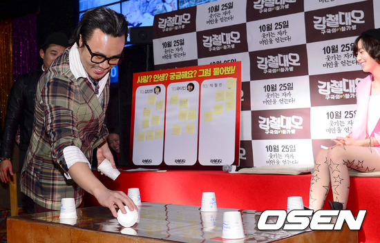 김인권이 테이블에 종이컵 셋팅 기술을 선보인뒤 마음대로 세팅이 되지 않자 아쉬워하고 있다. / youngrae@osen.co.kr