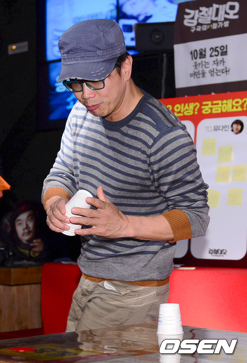 박철민이 테이블에 종이컵 세팅 기술을 선보이고 있다. / youngrae@osen.co.kr