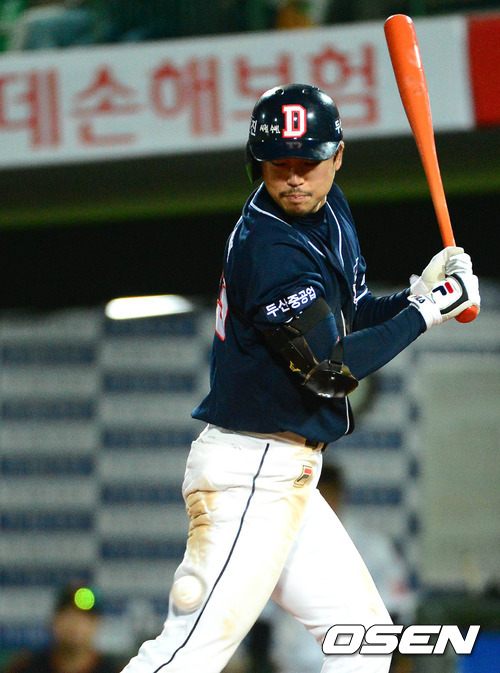 11일 오후 부산 사직구장에서 열린 2012 팔도 프로야구 준플레이오프 3차전 두산 베어스와 롯데 자이언츠의 경기, 5회초 2사 1,2루 두산 오재원이 롯데 김성배의 투구를 맞고 있다.