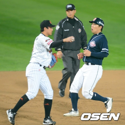 11일 오후 부산 사직구장에서 열린 2012 팔도프로야구 준플레이오프 3차전 두산 베어스와 롯데 자이언츠 경기, 7회말 무사 1,2루 최준석 보내기 번트때 2루 주자 김현수 3루에서 포스아웃 되며 아쉬워하고 있다.