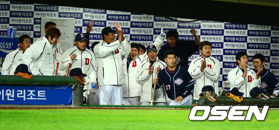 11일 오후 부산 사직구장에서 열린 2012 팔도 프로야구 준플레이오프 3차전 두산 베어스와 롯데 자이언츠의 경기, 7회초 무사 1,3루에서 두산 윤석민이 1타점 적시타를 날리자 더그아웃의 동료선수들이 기뻐하고 있다.
