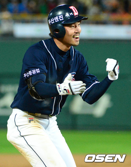 11일 오후 부산 사직구장에서 열린 2012 팔도 프로야구 준플레이오프 3차전 두산 베어스와 롯데 자이언츠의 경기, 7회초 1사 1,2루 두산 오재원이 중전 2타점 적시 3루타를 치고 환호하고 있다.