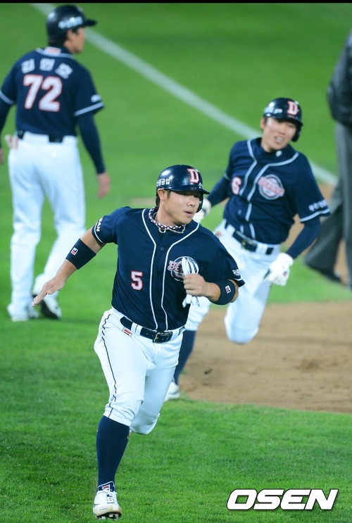 11일 오후 부산 사직구장에서 열린 2012 팔도프로야구 준플레이오프 3차전 두산 베어스와 롯데 자이언츠 경기, 7회초 1사 1,2루 오재원 2타점 적시타때 윤석민, 허경민 1,2루 주자가 득점을 올리고 있다.