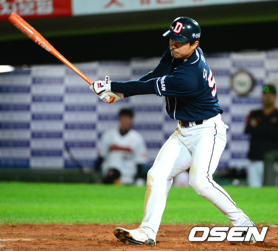 11일 오후 부산 사직구장에서 열린 2012 팔도 프로야구 준플레이오프 3차전 두산 베어스와 롯데 자이언츠의 경기, 7회초 1사 1,2루 두산 오재원이 중전 2타점 적시 3루타를 치고 있다.