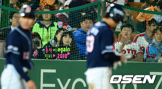 11일 오후 부산 사직구장에서 열린 2012 팔도 프로야구 준플레이오프 3차전 두산 베어스와 롯데 자이언츠의 경기, 7회초 1사 1,2루에서 두산 오재원이 2타점 적시 3루타를 날리고 기뻐하고 있다. 너머로 두산 팬의 'again 2010' 문구가 눈에 띈다