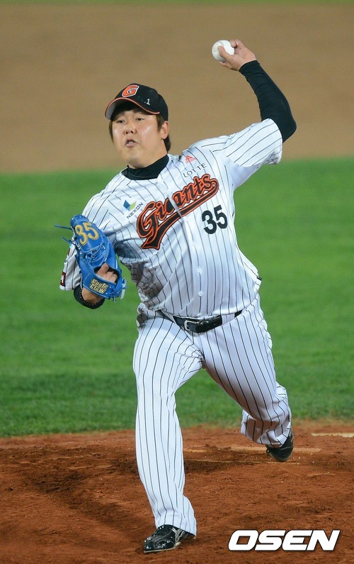 11일 오후 부산 사직구장에서 열린 2012 팔도프로야구 준플레이오프 3차전 두산 베어스와 롯데 자이언츠 경기, 8회초 2사1루 김현수 타석때 롯데 이명우 투수가 공을 뿌리고 있다.