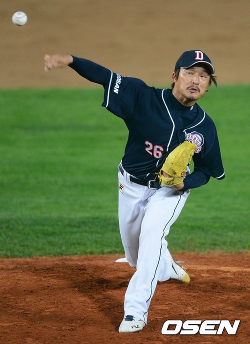 11일 오후 부산 사직구장에서 열린 2012 팔도프로야구 준플레이오프 3차전 두산 베어스와 롯데 자이언츠 경기, 8회말 2사 홍성흔 타석때 두산 김상현 투수가 마운드에 올라 공을 뿌리고 있다.