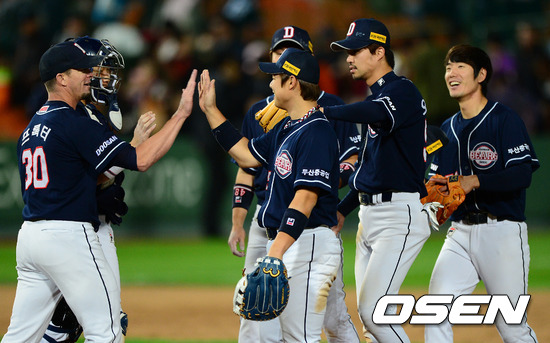경기후 승리를 거둔 두산 선수들이 하이파이브를 하고 있다./jpnews@osen.co.kr