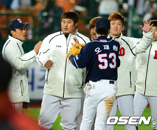 경기후 승리를 거둔 두산 선수들이 하이파이브를 하고 있다./jpnews@osen.co.kr