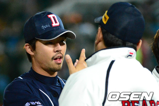 경기 종료 후 두산 오재원이 코칭스태프와 하이파이브를 하고 있다. / sunday@osen.co.kr