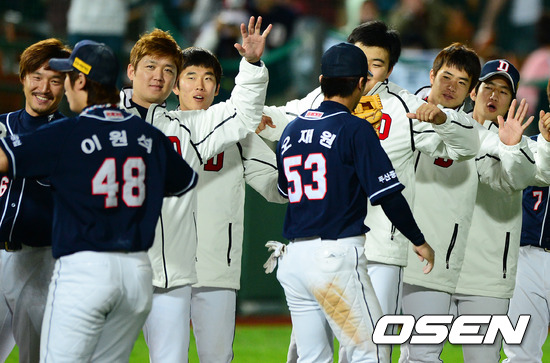경기후 4차전 선발로 예고된 두산 김선우가 동료선수들과 하이파이브를 하고 있다./jpnews@osen.co.kr