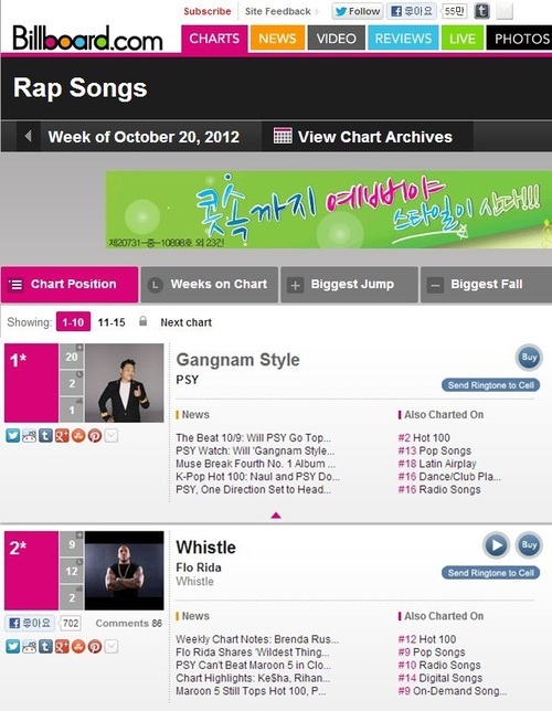 가수 싸이가 빌보드 랩 부문 차트에서 플로 라이다를 누르고 1위를 차지했다.