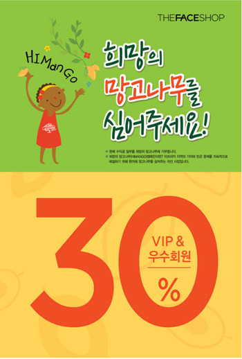 더페이스샵은 2010년부터 (사)희망의 망고나무와 협약하고 아프리카 난민에 망고나무를 심어주는 사회공헌활동 ‘희망고 캠페인’을 진행해 오고 있으며, 이번 할인행사는 캠페인의 일환이다.
