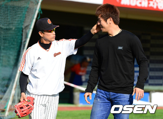 12일 오후 부산 사직구장에서 열린 2012 팔도 프로야구 준플레이오프 4차전 두산 베어스와 롯데 자이언츠의 경기, 경기에 앞서 부상으로 병원에 입원했던 강민호가 그라운드를 찾아 권두조 코치와 이야기를 나누고 있다.