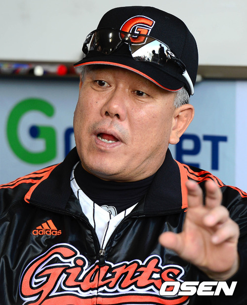 12일 오후 부산 사직구장에서 열린 2012 팔도 프로야구 준플레이오프 4차전 두산 베어스와 롯데 자이언츠의 경기, 경기에 앞서 롯데 양승호 감독이 취재진과 이야기를 나누고 있다.