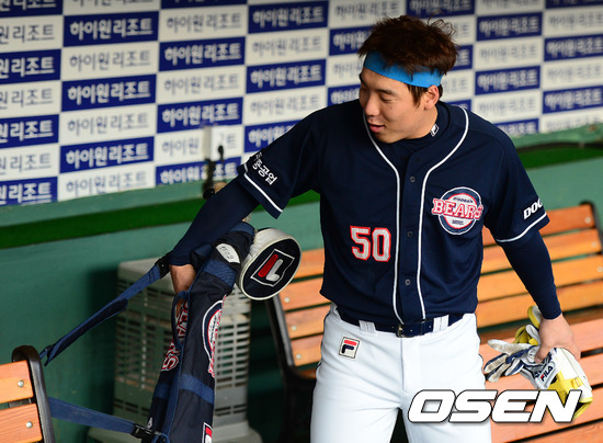 12일 오후 부산 사직구장에서 열린 2012 팔도 프로야구 준플레이오프 4차전 두산 베어스와 롯데 자이언츠의 경기, 경기에 앞서 두산 김현수가 가방이 의자에 걸리자 장난을 치며 혼잣말로 화풀이하고 있다.