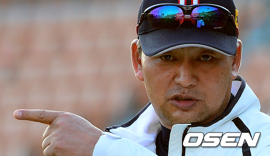 12일 오후 부산 사직구장에서 열린 2012 팔도 프로야구 준플레이오프 4차전 두산 베어스와 롯데 자이언츠의 경기, 경기에 앞서 두산 김진욱 감독이 그라운드에 나와 선수들을 지도하고 있다.