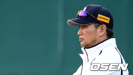 12일 오후 부산 사직구장에서 열린 2012 팔도 프로야구 준플레이오프 4차전 두산 베어스와 롯데 자이언츠의 경기, 경기에 앞서 두산 김진욱 감독이 훈련중인 선수들을 바라보고 있다.