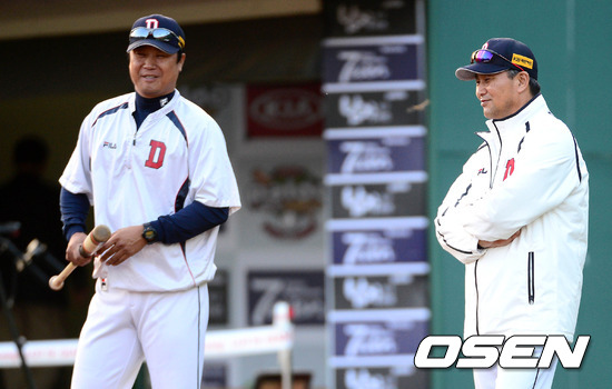 12일 오후 부산 사직구장에서 열린 2012 팔도 프로야구 준플레이오프 4차전 두산 베어스와 롯데 자이언츠의 경기, 경기에 앞서 두산 장원진 코치와 김진욱 감독이 이야기를 나누고 있다.