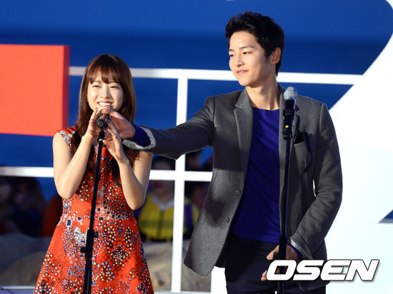 12일 오후 해운대 비프빌리지 야외무대에서 진행된 '늑대소년' 행사에서 송중기가 박보영 마이크를 위치를 맞춰주고 있다.