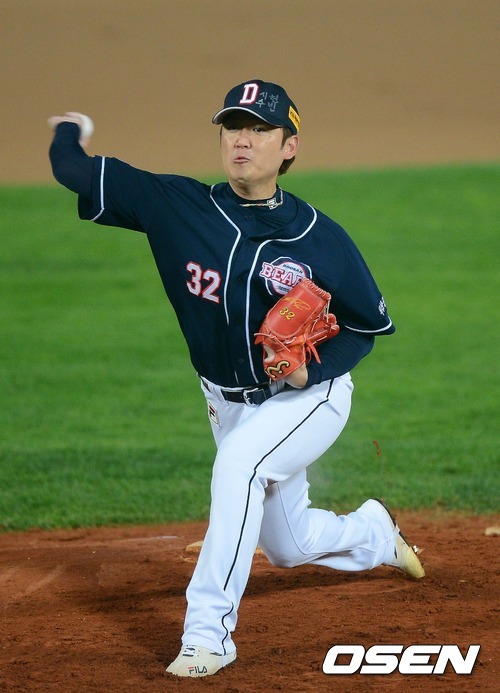 12일 오후 부산 사직구장에서 열린 2012 팔도프로야구 준플레이오프 4차전 두산 베어스와 롯데 자이언츠 경기, 두산 선발 김선우가 역투를 펼치고 있다.