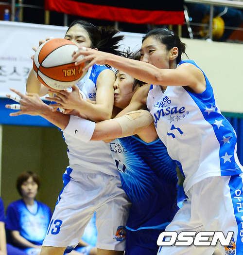 12일 오후 구리시체육관에서 열린 ‘KDB금융그룹 2012-2013 여자프로농구’ KDB생명과 우리은행의 공식 개막전에서 3쿼터 KDB생명 조은주가 우리은행 임영희 이승아와 리바운드 다툼을 하고 있다.