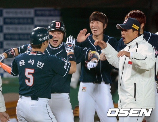 12일 오후 부산 사직구장에서 열린 2012 팔도프로야구 준플레이오프 4차전 두산 베어스와 롯데 자이언츠 경기, 2회초 선두타자 윤석민 좌중월 솔로 홈런을 날리고 동료들의 환영을 받고 있다.