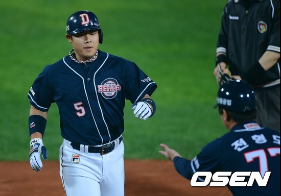 12일 오후 부산 사직구장에서 열린 2012 팔도프로야구 준플레이오프 4차전 두산 베어스와 롯데 자이언츠 경기, 2회초 선두타자 윤석민 좌중월 솔로 홈런을 날리고 홈인 전형도 코치의 환영을 받고 있다.