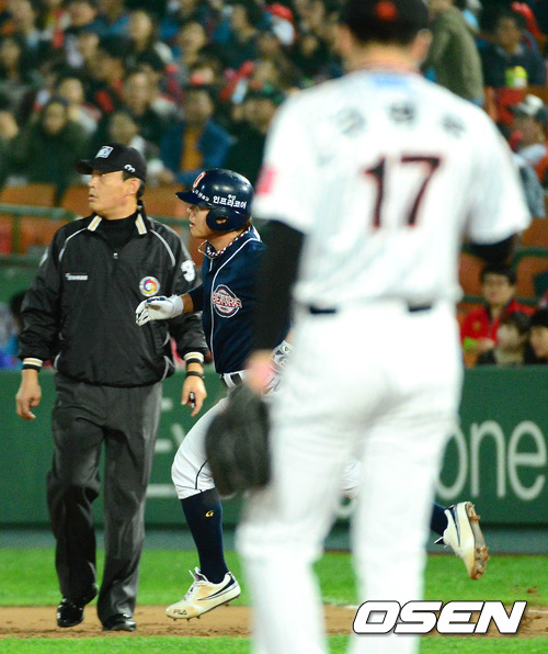 12일 오후 부산 사직구장에서 열린 2012 팔도 프로야구 준플레이오프 4차전 두산 베어스와 롯데 자이언츠의 경기, 2회초 무사 두산 윤석민이 선제 좌중월 솔로홈런을 치고 그라운드를 돌고 있다.