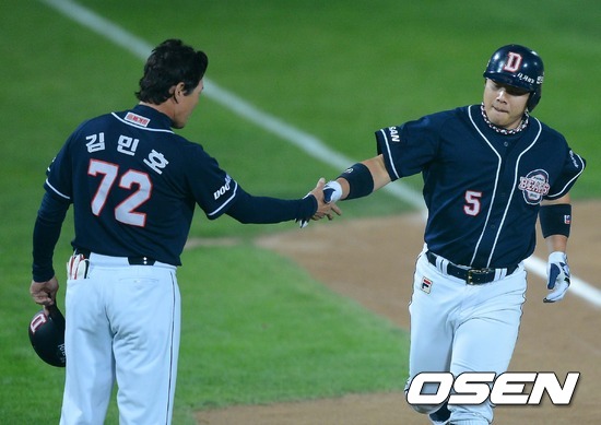 12일 오후 부산 사직구장에서 열린 2012 팔도프로야구 준플레이오프 4차전 두산 베어스와 롯데 자이언츠 경기, 2회초 선두타자 윤석민 좌중월 솔로 홈런을 날리고 김민호 코치의 환영을 받으며 홈인하고 있다.