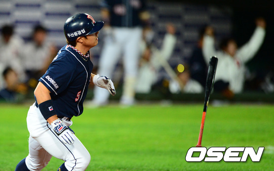 12일 오후 부산 사직구장에서 열린 2012 팔도 프로야구 준플레이오프 4차전 두산 베어스와 롯데 자이언츠의 경기, 2회초 무사에서 두산 윤석민이 선제 솔로포를 날리고 있다.