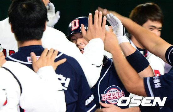12일 오후 부산 사직구장에서 열린 2012 팔도 프로야구 준플레이오프 4차전 두산 베어스와 롯데 자이언츠의 경기, 2회초 무사 두산 윤석민이 선제 좌중월 솔로홈런을 치고 더그아웃에서 동료들의 축하를 받고 있다.