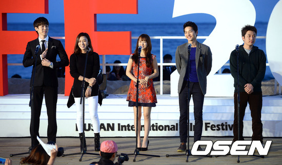 12일 오후 해운대 비프빌리지 야외무대에서 진행된 '늑대소년' 행사에서 유연석 장영남 박보영 송중기 조성희 감독이 팬들을 바라보며 미소짓고 있다.