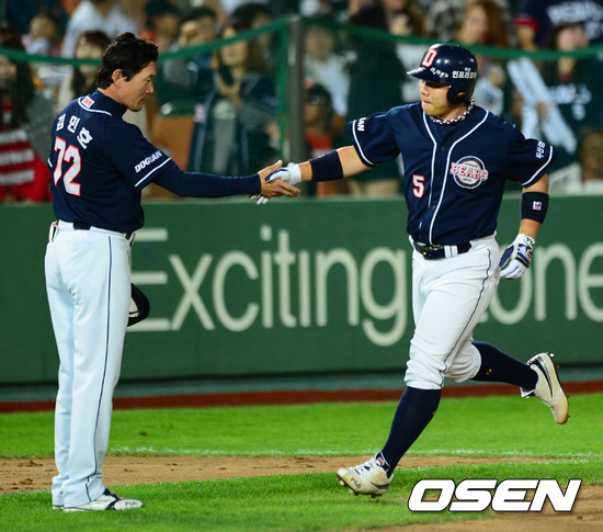 12일 오후 부산 사직구장에서 열린 2012 팔도 프로야구 준플레이오프 4차전 두산 베어스와 롯데 자이언츠의 경기, 2회초 무사에서 두산 윤석민이 선제 솔로포를 날리고 김민호 코치와 하이파이브를 하고 있다.