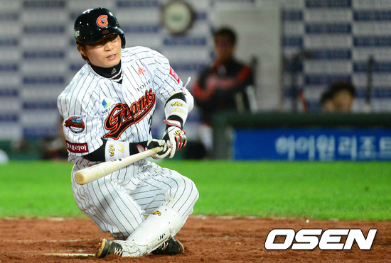 12일 오후 부산 사직구장에서 열린 2012 팔도 프로야구 준플레이오프 4차전 두산 베어스와 롯데 자이언츠의 경기, 2회말 2사 1,2루 롯데 용덕한이 자신의 타구에 다리를 맞고 넘어지고 있다.