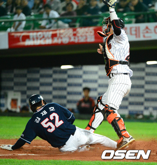 12일 오후 부산 사직구장에서 열린 2012 팔도 프로야구 준플레이오프 4차전 두산 베어스와 롯데 자이언츠의 경기, 3회초 2사 1,2루 두산 윤석민의 좌전 적시타때 2루주자 김재호가 홈으로 쇄도해 세이프 되고 있다.