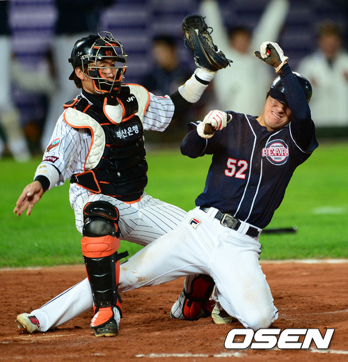 12일 오후 부산 사직구장에서 열린 2012 팔도 프로야구 준플레이오프 4차전 두산 베어스와 롯데 자이언츠의 경기, 3회초 2사 1,2루에서 두산 윤석민의 1타점 적시타에 김재호가 롯데 용덕한의 태그에 앞서 세이프 되고 있다.