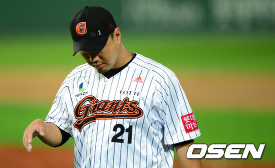12일 오후 부산 사직구장에서 열린 2012 팔도 프로야구 준플레이오프 4차전 두산 베어스와 롯데 자이언츠의 경기, 3회초 1사 1,2루에 등판한 롯데 송승준이 1실점을 하고 수비를 마치며 아쉬워하고 있다.