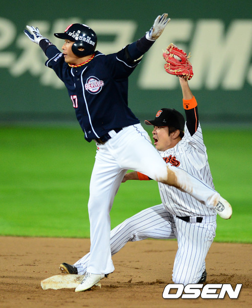 12일 오후 부산 사직구장에서 열린 2012 팔도 프로야구 준플레이오프 4차전 두산 베어스와 롯데 자이언츠의 경기, 4회초 무사에서 두산 임재철이 우전안타를 날렸지만 2루에서 롯데 문규현에 태그아웃 당하고 있다.