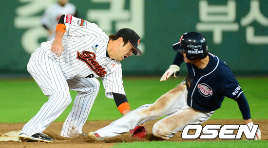 12일 오후 부산 사직구장에서 열린 2012 팔도 프로야구 준플레이오프 4차전 두산 베어스와 롯데 자이언츠의 경기, 4회초 2사 1루 두산 오재원 타석때 1루주자 김재호가 도루를 시도했으나 태그아웃 처리되고 있다.