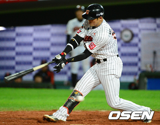 12일 오후 부산 사직구장에서 열린 2012 팔도 프로야구 준플레이오프 4차전 두산 베어스와 롯데 자이언츠의 경기, 4회말 무사 1,2루 롯데 박종윤이 헛스윙 삼진을 당하고 있다.