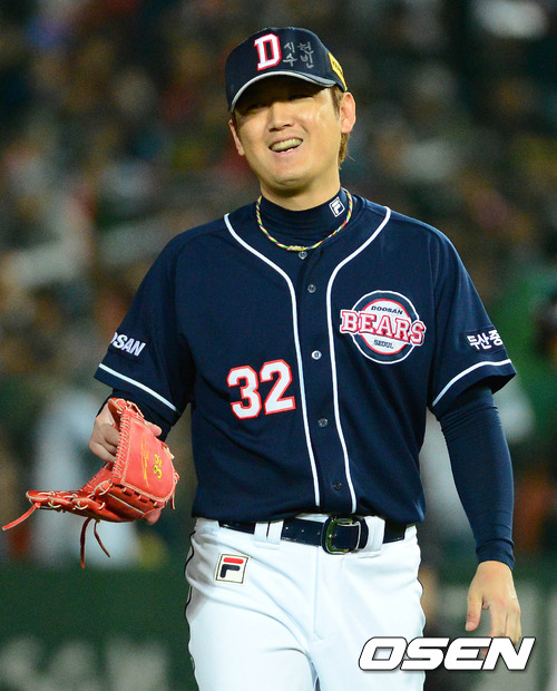 12일 오후 부산 사직구장에서 열린 2012 팔도 프로야구 준플레이오프 4차전 두산 베어스와 롯데 자이언츠의 경기, 4회말 2사 만루 롯데 용덕한을 내야땅볼로 처리한 두산 김선우가 더그아웃으로 가며 환하게 웃고 있다.