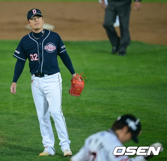 12일 오후 부산 사직구장에서 열린 2012 팔도프로야구 준플레이오프 4차전 두산 베어스와 롯데 자이언츠 경기, 4회말 2사 만루 두산 선발 김선우 용덕한의 투수앞 땅볼때 아웃처리 시키며 덕아웃을 향하고 있다.