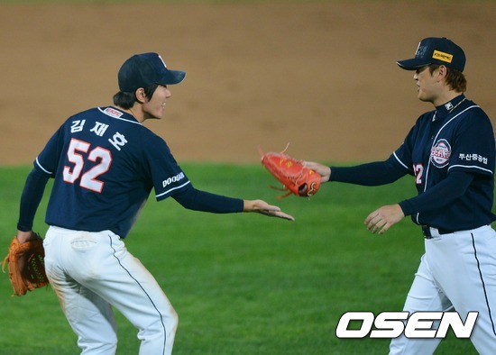12일 오후 부산 사직구장에서 열린 2012 팔도프로야구 준플레이오프 4차전 두산 베어스와 롯데 자이언츠 경기, 4회말 2사 만루 두산 선발 김선우가 용덕한을 아웃처리 시키며 공수교대때 김재호 유격수와 하이파이브를 하고 있다.