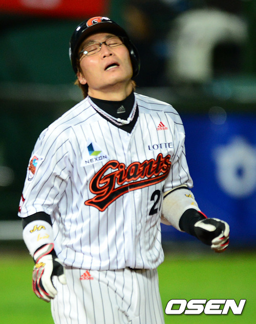 12일 오후 부산 사직구장에서 열린 2012 팔도 프로야구 준플레이오프 4차전 두산 베어스와 롯데 자이언츠의 경기, 4회말 2사 만루에서 롯데 용덕한이 투수앞 땅볼로 물러나며 아쉬워하고 있다.
