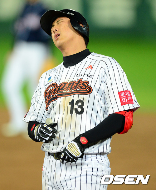 12일 오후 부산 사직구장에서 열린 2012 팔도 프로야구 준플레이오프 4차전 두산 베어스와 롯데 자이언츠의 경기, 4회말 2사 1,2루에서 롯데 황재균이 좌전안타를 날렸지만 타점으로 연결 안되자 아쉬워하고 있다.