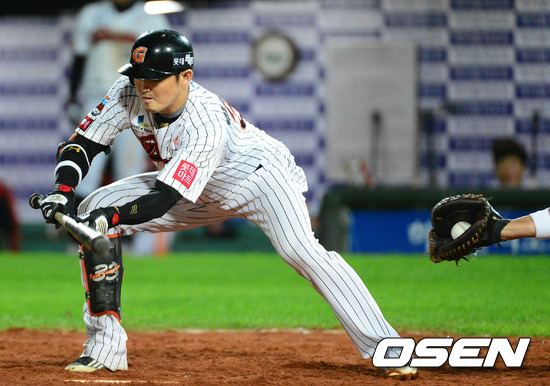 12일 오후 부산 사직구장에서 열린 2012 팔도 프로야구 준플레이오프 4차전 두산 베어스와 롯데 자이언츠의 경기, 4회말 무사 1,2루 롯데 박종윤이 번트에 실패하고 있다.