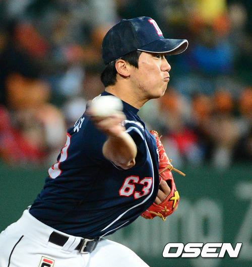 12일 오후 부산 사직구장에서 열린 2012 팔도 프로야구 준플레이오프 4차전 두산 베어스와 롯데 자이언츠의 경기, 6회말 1사 두산 김창훈과 교체된 변진수가 힘차게 공을 던지고 있다.
