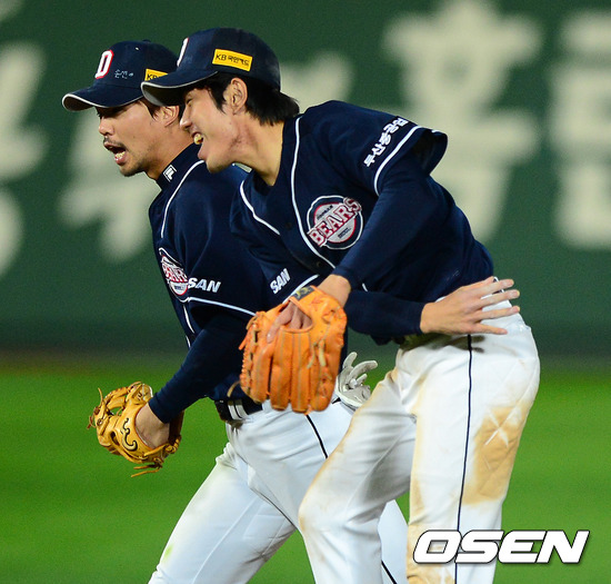 12일 오후 부산 사직구장에서 열린 2012 팔도 프로야구 준플레이오프 4차전 두산 베어스와 롯데 자이언츠의 경기, 6회말 1사에서 두산 오재원과 김재호가 롯데 김문수의 내야땅볼을 병살로 처리하고 기뻐하고 있다.