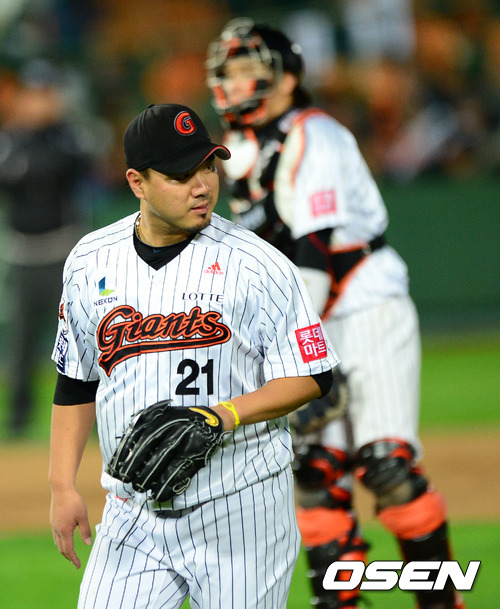 12일 오후 부산 사직구장에서 열린 2012 팔도 프로야구 준플레이오프 4차전 두산 베어스와 롯데 자이언츠의 경기, 7회초 2사 1루에서 롯데 송승준이 마운드를 내려오고 있다.